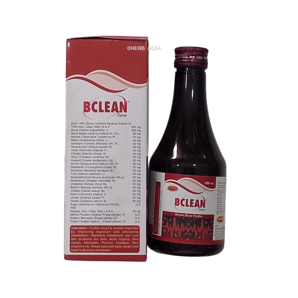 Bclean Syrup is an Ayurvedic blood purifier that helps detoxify the blood, improve circulation, and promote clear, healthy skin. It’s effective for acne, pimples, boils, ringworm, and enhancing natural skin glow.