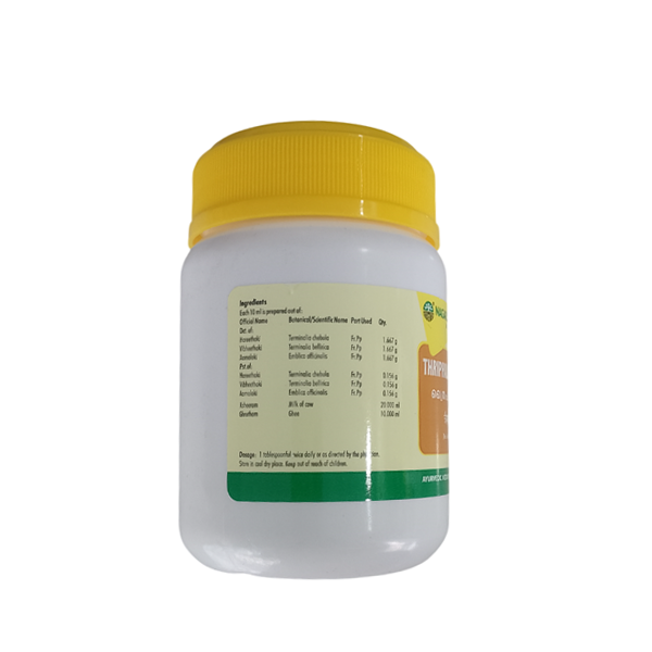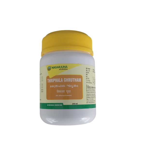 Nagarjuna Thriphala Ghrutham delivers classical Ayurvedic support for eye and digestive health. It actively nourishes the eyes and improves visual comfort. Additionally, it supports healthy digestion and enhances gut function. Moreover, the formulation promotes natural detoxification and assists in eliminating toxins from the body. Furthermore, it helps maintain bowel regularity and supports tissue rejuvenation. As a result, it improves overall vitality and balances Pitta and Vata doshas effectively.