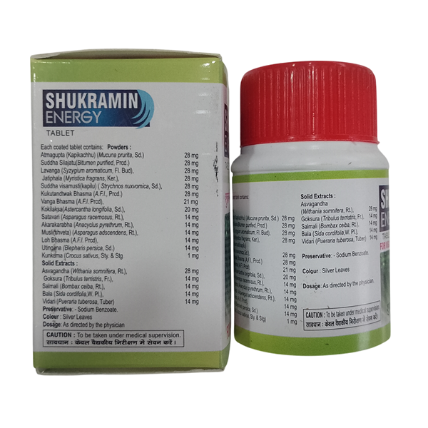 Shukramin Energy Tablet is a natural stamina & energy booster supplement formulated to enhance your energy, stamina, and overall vitality. Made with a powerful blend of traditional herbs, it also helps combat fatigue, supports physical strength, and promotes endurance. Ideal for those facing daily stress, low energy, or weakness, Shukramin works holistically to rejuvenate the body and mind, helping you stay active and refreshed throughout the day.